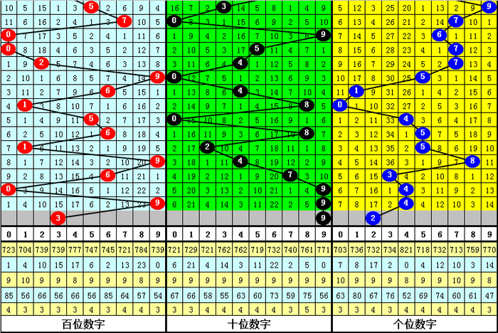 百位分析:上期出现号码9为:大号、合数,在连续9期开奖中,百位分别为:大号、合数:6;小 号、质数:1;大号、质数:5;大号、合数:6;小 号、质数:1;大号、合数:9;大号、合数:6;小 号、合数:0;大号、合数:9,其中小 号出现频繁,质数开出较热,百位本期预计开出小 号、质数。