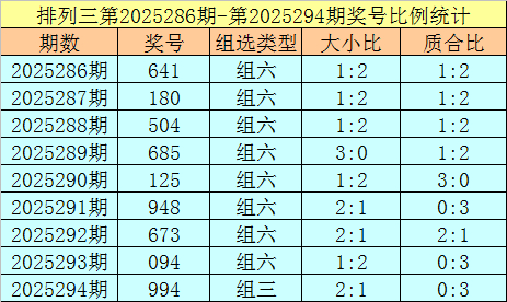 上期回顾:排列三第2025294奖号开出994,奖号质合比为0:3,大小比为2:1,跨度为5,类型为组三。
