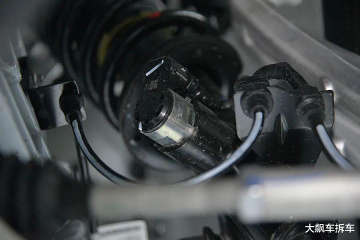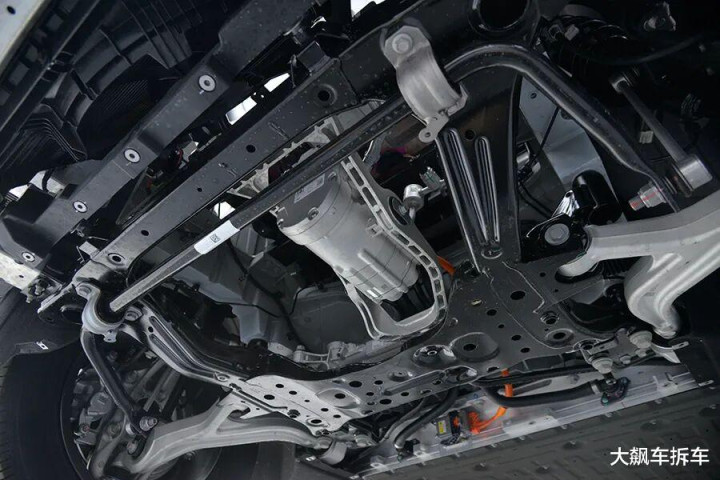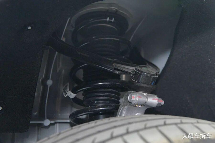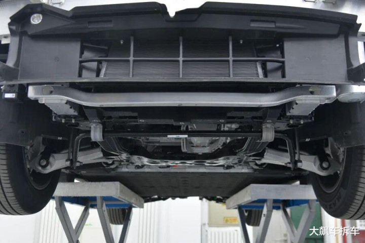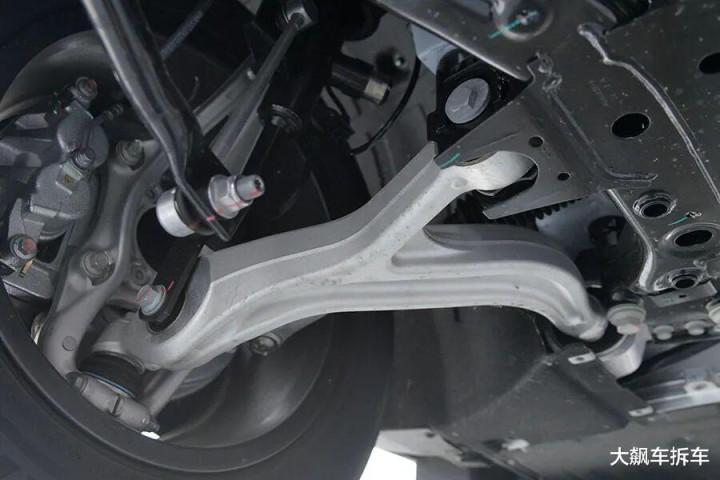 前悬是豪车常用的双叉臂结构,下叉臂是铝合金材质,上叉臂是单层冲压钢板,显然是为了成本考量。