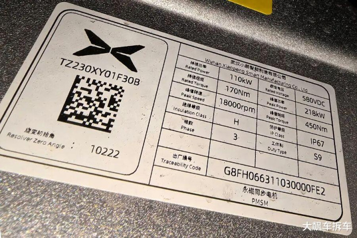 后电机是永磁同步电机,最大功率218千瓦,最大扭矩450牛米,工作电压580伏,供应商是小鹏自己的工厂,电机外面没有包裹隔音材料。