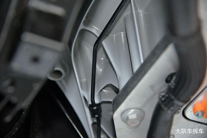 前纵梁有多道溃缩诱导褶皱,发生碰撞时可以更合理的吸能。