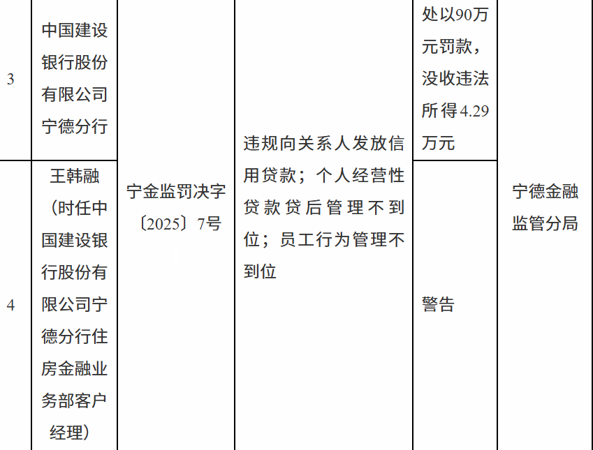 10月20日,宁德金融监管分局行政处罚信息公示表显示,中国建设银行股份有限公司宁德分行因违规向关系人发放信用贷款;个人经营性贷款贷后管理不到位;员工行为管理不到位被处以90万元罚款,没收违法所得4.29万元;王某融被警告。