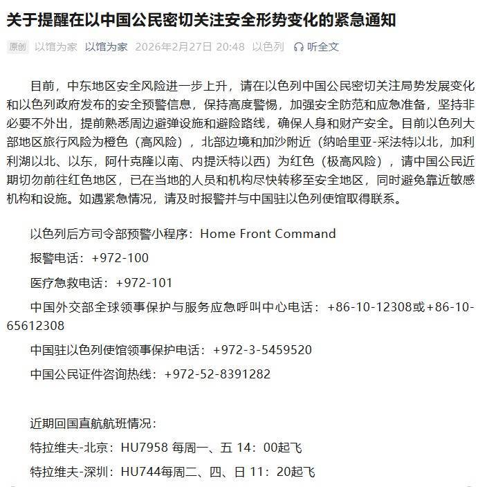 2月27日,中国驻以色列使馆发布《关于提醒在以中国公民密切关注安全形势变化的紧急通知》:
